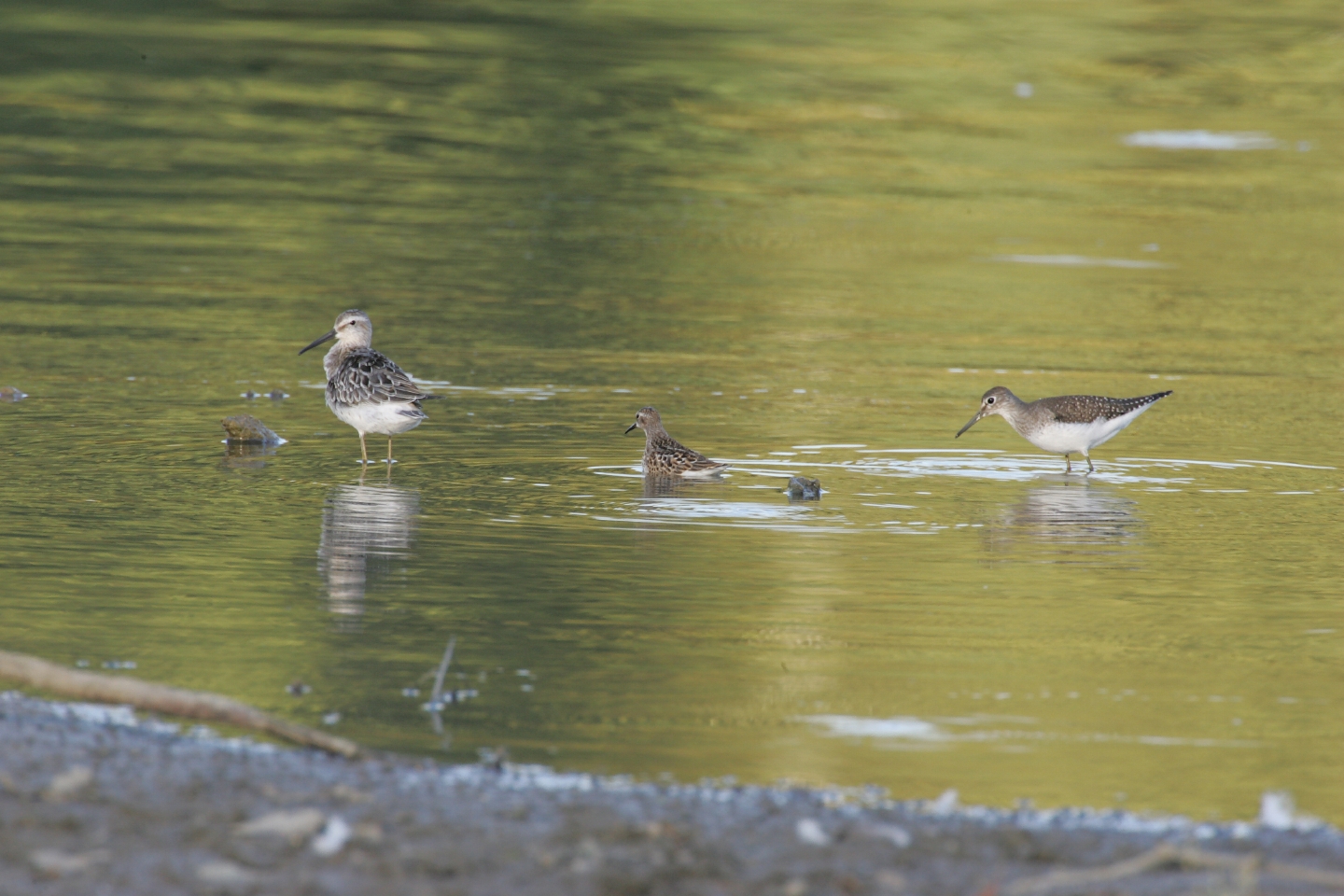 Stilt Sandpiper, Least Sandpiper, and Solitary Sandpiper Sharing the Bounty