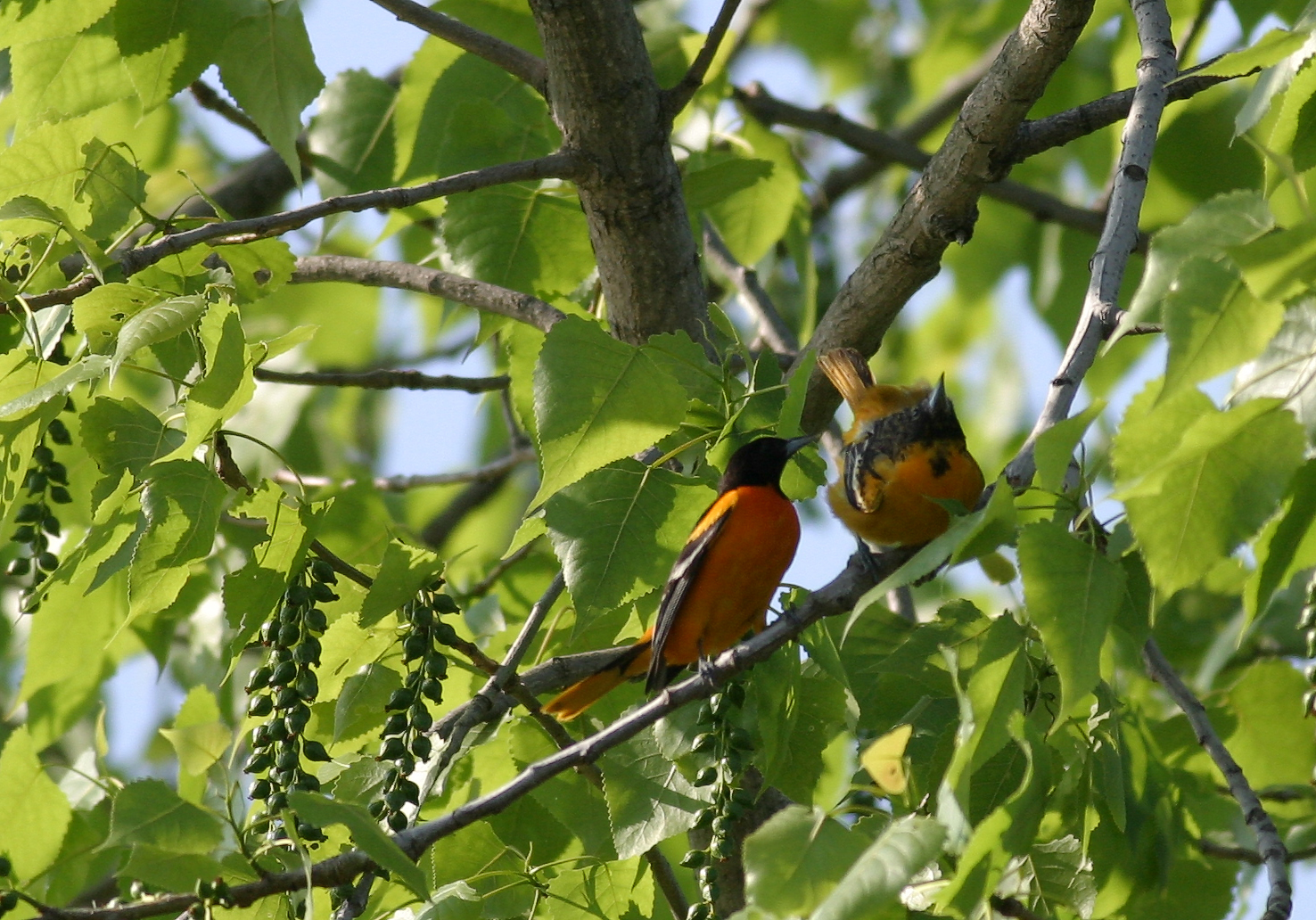 Baltimore Oriole Courtship- Icterus galbula, Order PASSERIFORMES - Family ICTERIDAE. Baltimore Orioles were everywhere today at the Gilmore Pond Conservancy in Hamilton Ohio. I encountered a pair courting.