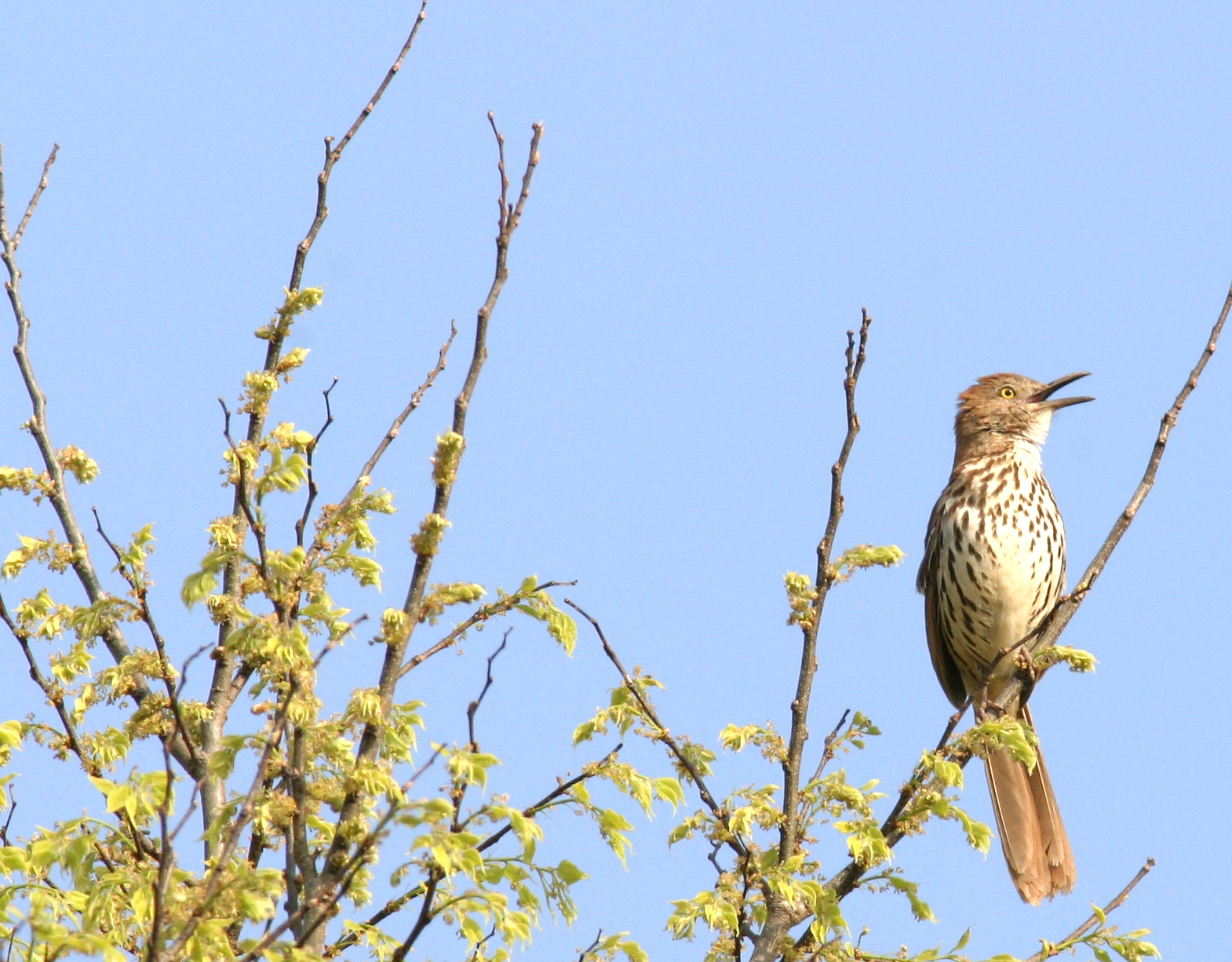 | Male Brown Thrasher- Toxostoma rufum, Order PASSERIFORMES - Family MIMIDAE. Today was a wonderful birding day--temps in the high 70's, clear skies, and excellent lighting. The males were singing up a storm! "A large, skulking bird of thickets and hedgerows, the Brown Thrasher has one of the largest song repertoires of any North American bird. Boldly patterned, it is conspicuous when singing on its territory. Song is a long series of variable phrases separated by pauses. Phrases usually uttered twice. Includes mimicked calls of other birds." I was lucky to find this male singing on a very wonderful mid-April day in Shaker Trace Wetlands in the Miami Whitewater Forest area in SW Ohio. (Photo: April 16, 2004, Canon 10D, EF 400mm f/5.6 L USM, 1.4x teleconverter EF ll lens, manual focus)
