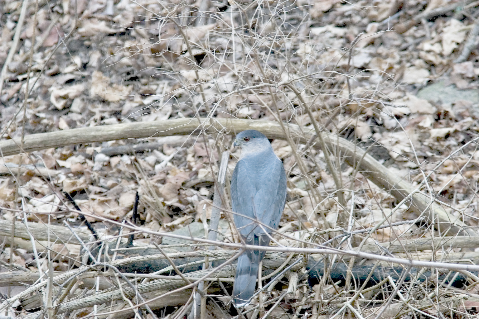 | Cooper's Hawk-Accipiter cooperii, Order FALCONIFORMES - Family ACCIPITRIDAE - Subfamily Accipitrinae. I saw a pair of these remarkable raptors with my friend Mark McPhail in his backyard (heavily wooded) in Oxford, Ohio. They hunt for prey in the woods (a True Forest Hawk) and often injure themselves. A recent study found that 23 percent of all Cooper's Hawks examined had healed fractures in the bones of the chest, especially of the furcula or wishbone. A winter resident. At the first molt, young birds frequently are bluish-grey in coloration. Length 14-20 inches. (Photo: Feb 29, 2004)