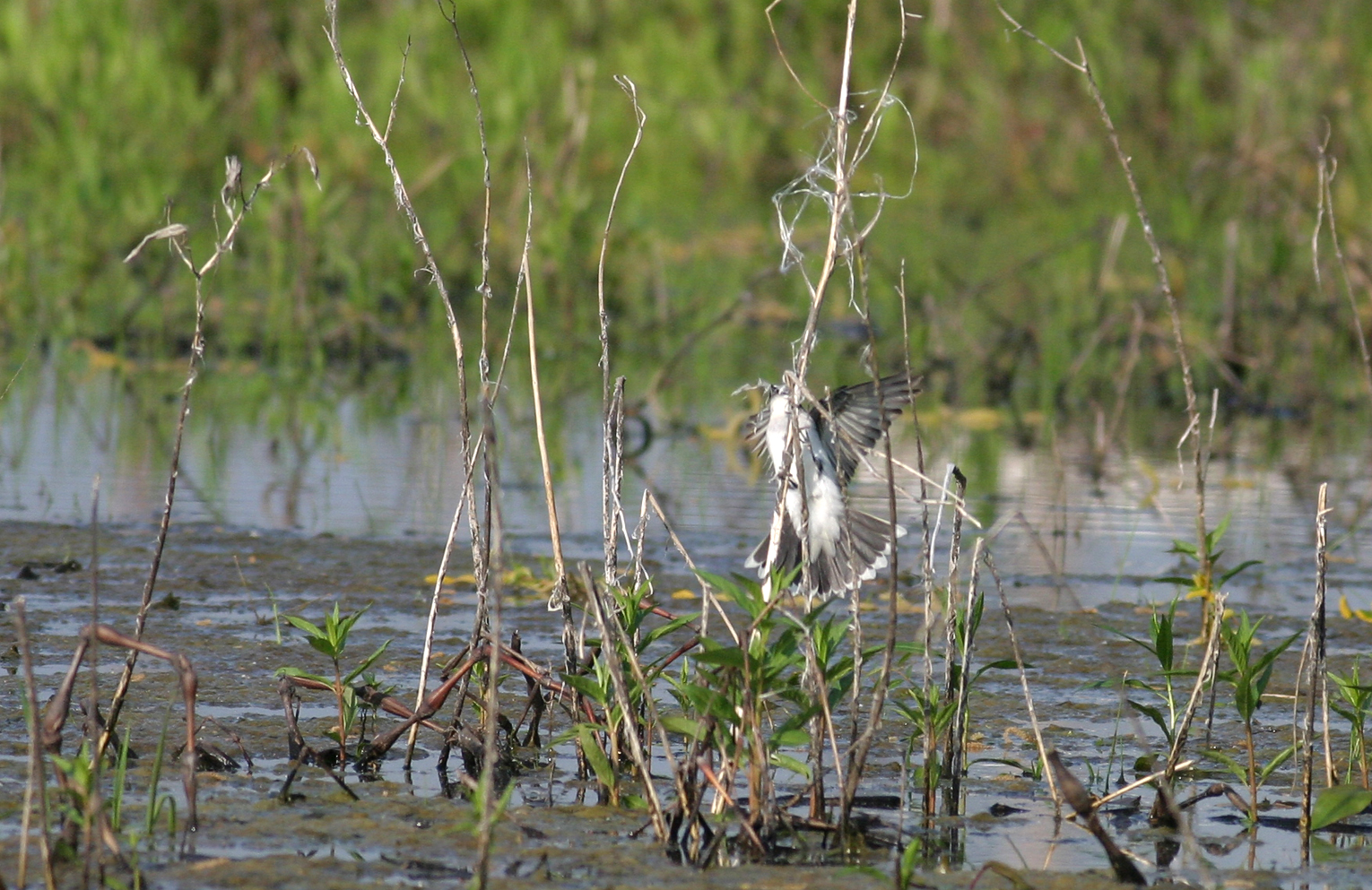 | Eastern Kingbird- Tyrannus tyrannus, Order PASSERIFORMES - Family TYRANNIDAE - Subfamily Tyranninae. This individual was courting and collecting nest material. Birds were quite active in the early morning at the Gilmore Pond Conservancy in Hamilton Ohio.