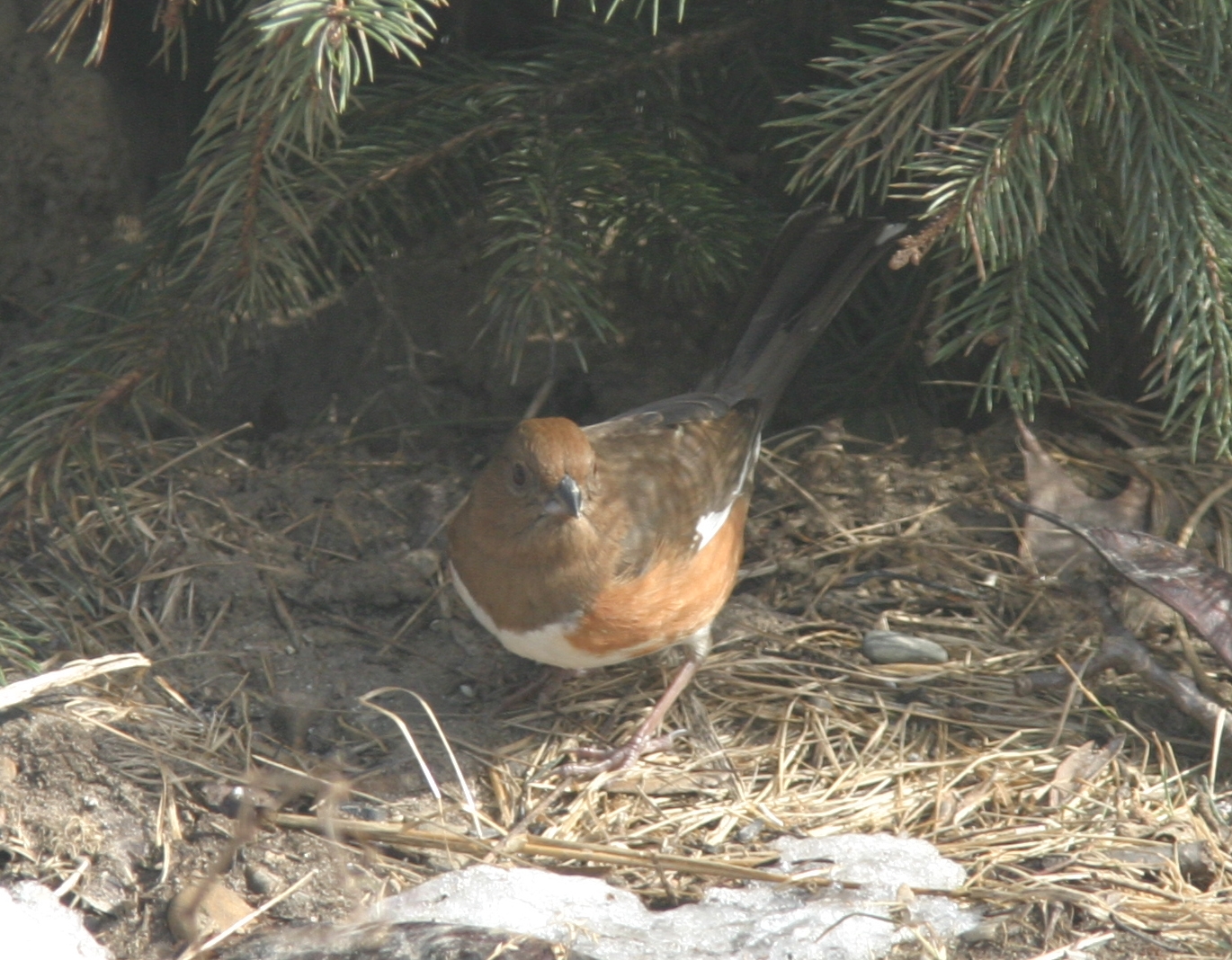 Female Eastern Towhee- Pipilo erythrophthalmus, Family EMBERIZIDAE. One of the largest sparrows. Diagnostics: Dark head and back (black in male, dark brown in female); white chest and belly, rufous sides and flanks. Male has black hood, back, wings and tail; female is dead-leaf brown where male is black. Winters in SW Ohio, migrates north during summer. (photo: feb, 2004, Canon 10D, EF 100- 400 mm f/4.5-5.6L IS lens)