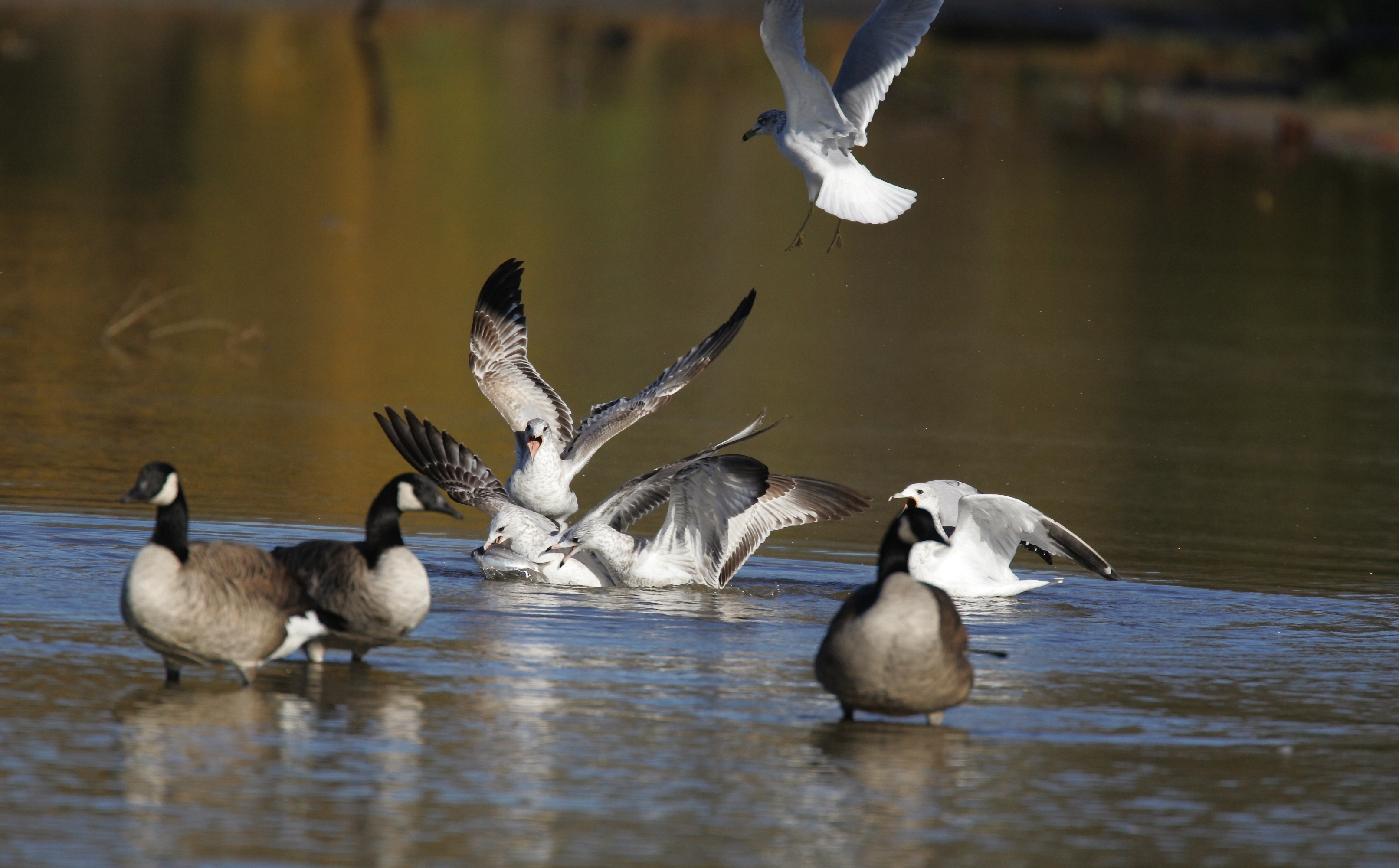 Ring-billed Gull- Larus delawarensis, Order CHARADRIIFORMES - Family LARIDAE - Subfamily Larinae. Shoot! I dropped it!No, now I have it! And everyone is interested! Acton Lake, Hueston Woods State Park.