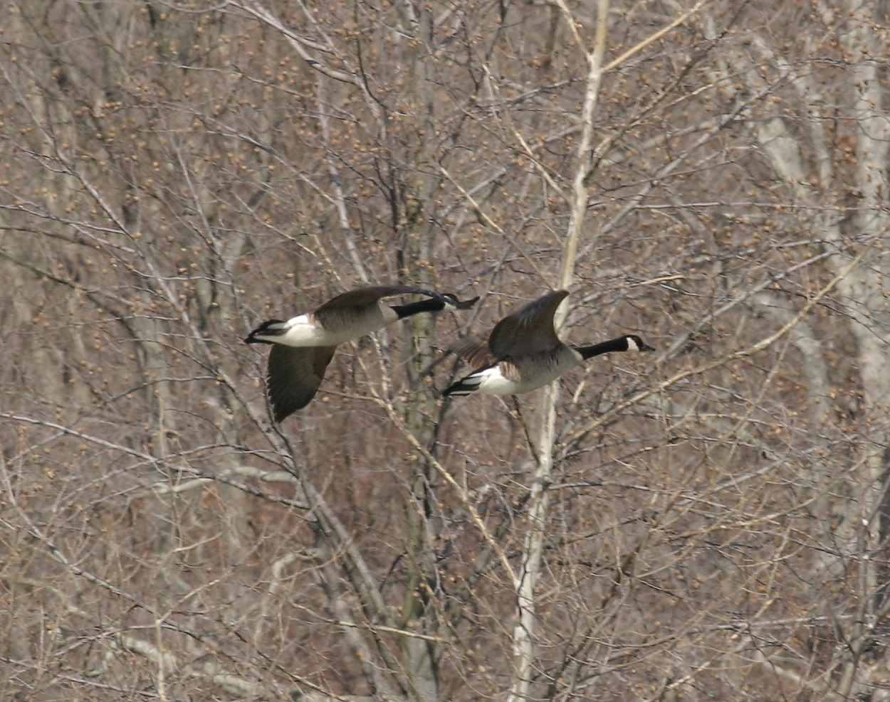 Canada Geese, Branta canadensis, Order ANSERIFORMES - Family ANATIDAE - Subfamily Anserinae. The most familiar and widespread goose in North America. Populations generally on the increase over last half century. These beauties were seen above Acton Lake in Heuston Woods State Park in Ohio. (photo: Feb 27, 2004)