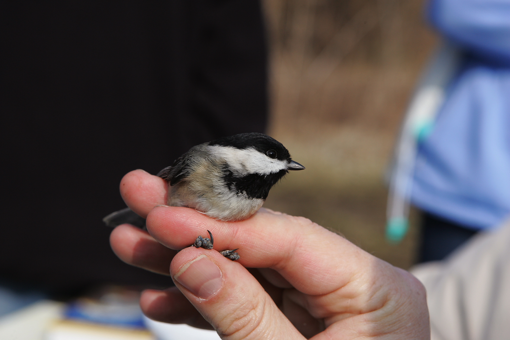 Carolina Chickadee- Poecile carolinensis, Order Passeriformes-Family Paridae. Dave held the bird for a photo profile. I had the pleasure of participating in Mist Netting at Acton Lake in Heuston Woods State Park with Dave and Jill Russel of Miami University. It was a seasonally cold late February morning. I learned a lot and look forward to the next time I can go. This Chickadee was one of eight birds caught in the mist nets.