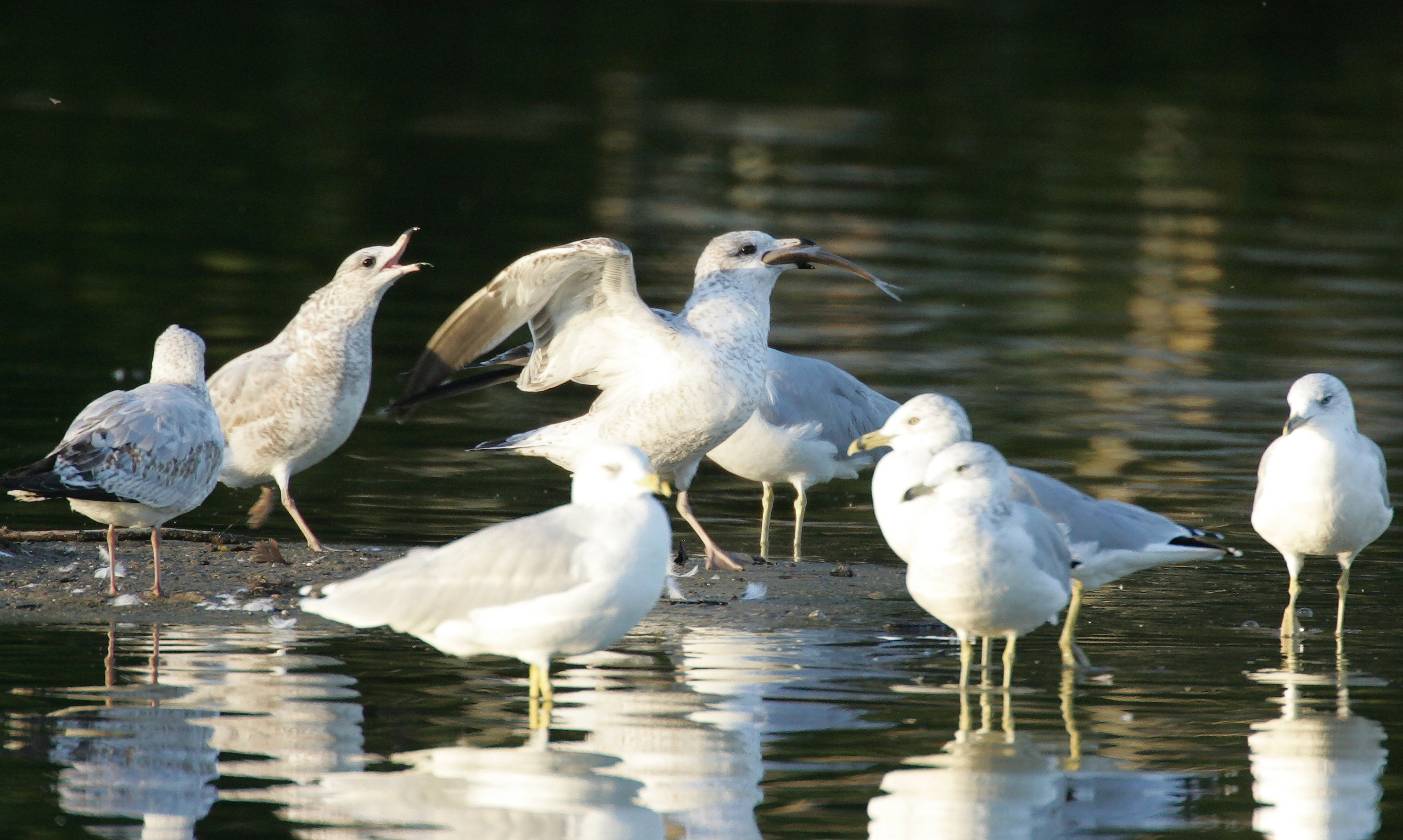 Ring_billed Gull- Larus delawarensis, Order CHARADRIIFORMES - Family LARIDAE - Subfamily Larinae. It's mine, all mine! What a catch!! And everyone is interested! Acton Lake, Hueston Woods State Park.