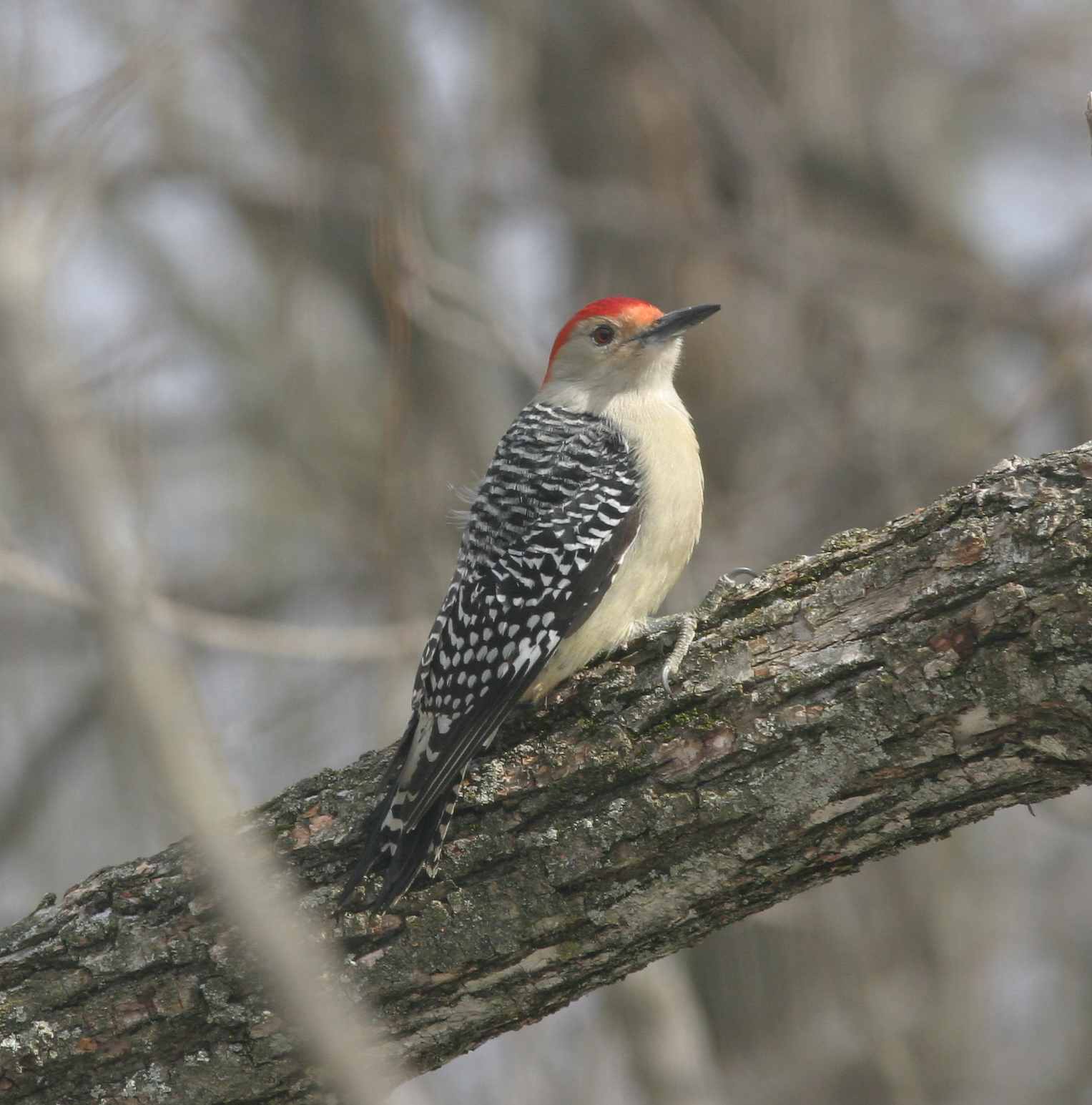 Male Red Bellied Woodpecker- Melanerpes carolinus, Family Picidae. Chisel-billed wood-boring birds with zygodactyl feet (two toes front, 2 rear). A zebra backed woodpecker with a red cap and white rump. This is a male--red covers crown and nape in male, only nape in female. (photo: Jan/Feb, 2004)