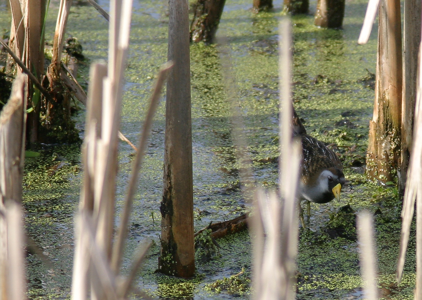 Sora- Porzana carolina, Family Rallidae (Rails, Gallinules and Coots). Wow! My first Sora. I had a rough time taking pictures through the reeds. This bird was near the observation tower in Spring Valley Nature area in SW Ohio on a beautiful sunny, mid-April day. (Photo: April 18, 2004, Canon 10D, EF 400mm f/5.6 L USM, 1.4x teleconverter EF ll lens, manual focus)