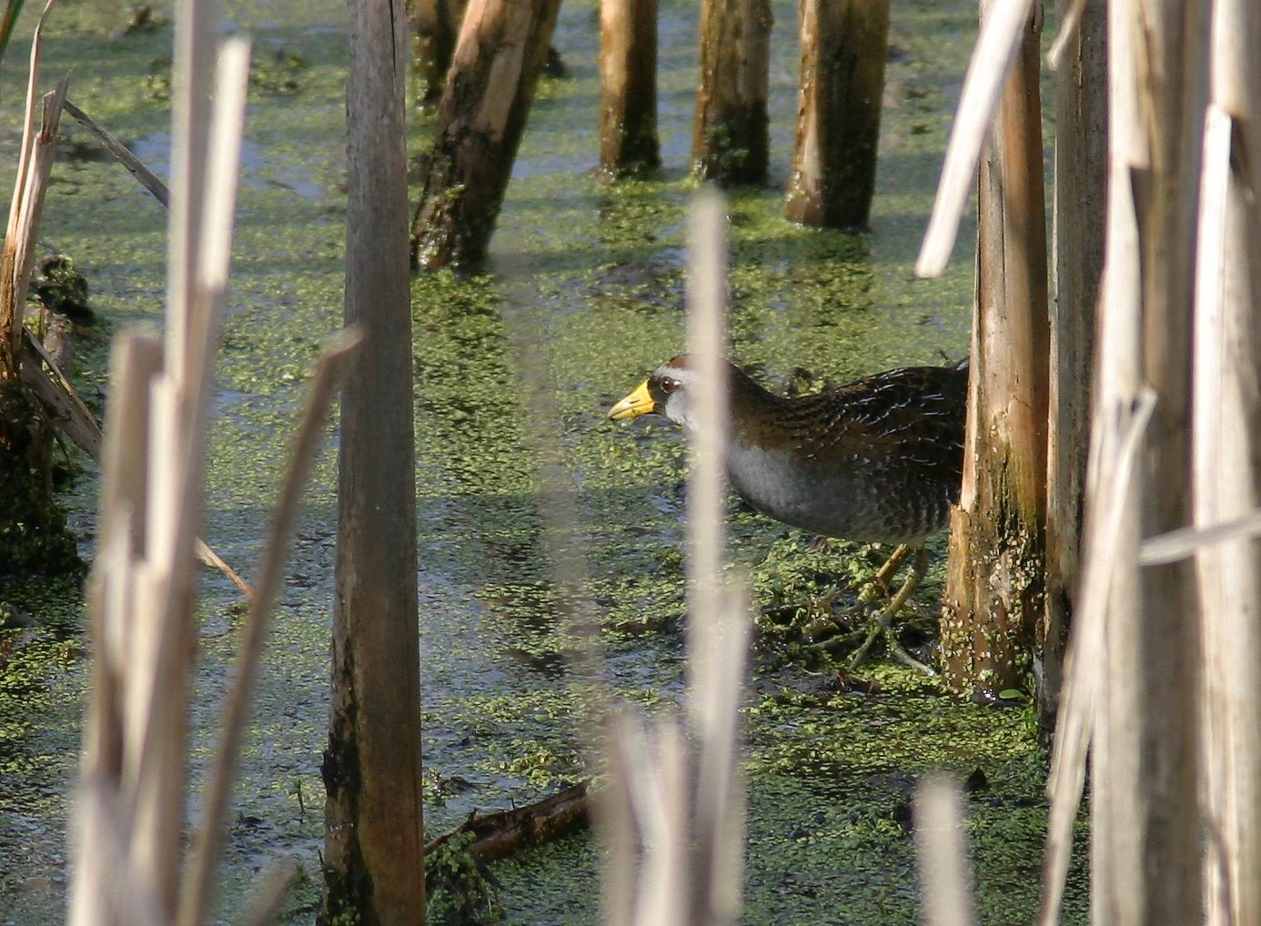 Sora- Porzana carolina, Family Rallidae (Rails, Gallinules and Coots). Wow! My first Sora. I had a rough time taking pictures through the reeds. This bird was near the observation tower in Spring Valley Nature area in SW Ohio on a beautiful sunny, mid-April day. (Photo: April 18, 2004, Canon 10D, EF 400mm f/5.6 L USM, 1.4x teleconverter EF ll lens, manual focus)