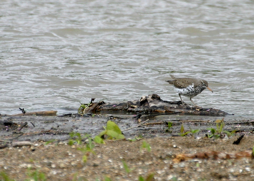 | Spotted Sandpiper- Actitis macularia, Order CHARADRIIFORMES - Family SCOLOPACIDAE - Subfamily Scolopacinae. These sandpipers were found in Acton Lake in Heuston Woods in early May near the north end of the lake on sandbars. Did you know that the male takes care of the young? Most unusual!