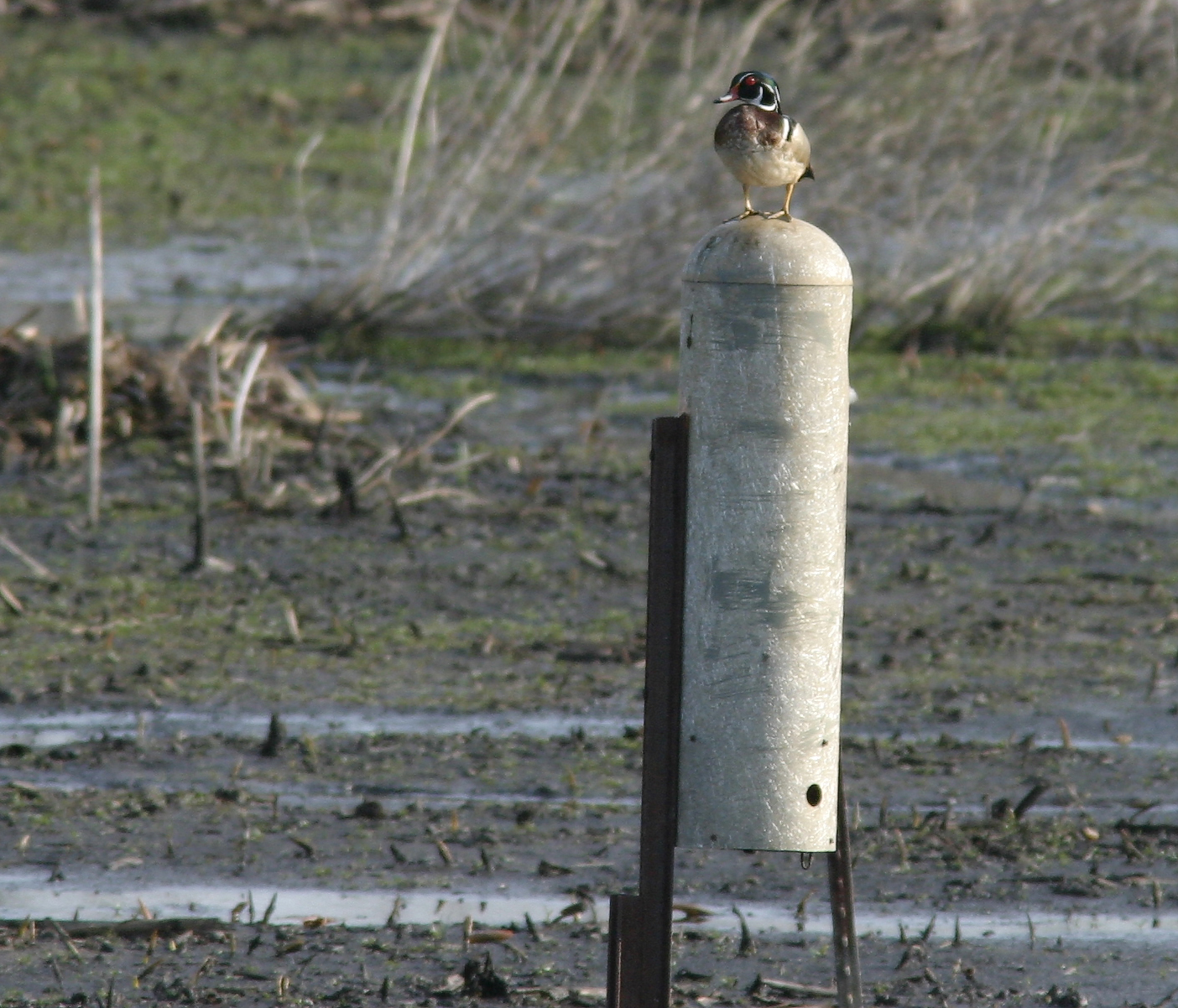 | Wood Duck-Aix sponsa, Order ANSERIFORMES - Family ANATIDAE - Subfamily Anatinae. Today was a wonderful birding day--temps in the low 80''s, clear skies, and excellent lighting. The male seemed to be guarding this nest box in Spring Valley. He was spectacular! (Photo: April 16, 2004, Canon 10D, EF 400mm f/5.6 L USM, 1.4x teleconverter EF ll lens, manual focus)